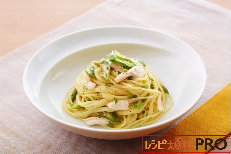 茹でて冷水でしめたスパゲッティを(1)に入れて混ぜ合わせる。