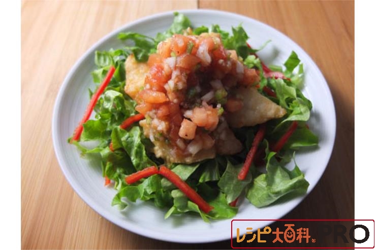 唐揚げにフレッシュな野菜を使ったさわやかなソースをかけて。さっぱりといただけます。
