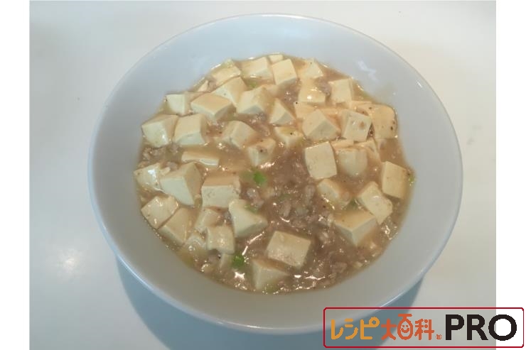 鍋(フライパン)にサラダ油を熱し、ひき肉を炒め、色が変わったら、(1)を加えて混ぜ合わせ、豆腐を加えて1分ほど煮込む。