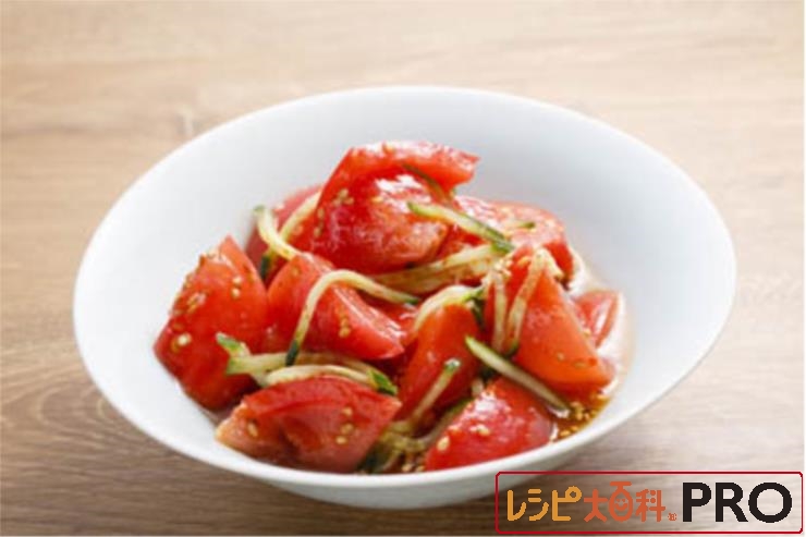 ボウルにトマト、きゅうりを入れ、Aを加えて混ぜ合わせる。