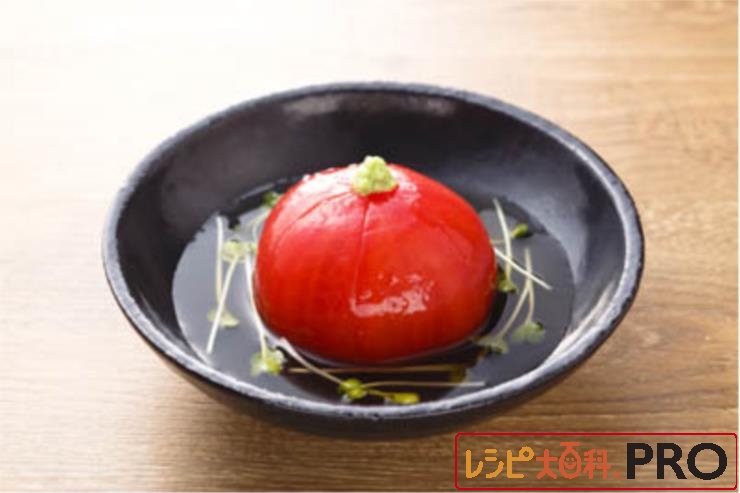 器にトマトを盛り、(1)をかけ、貝割れ菜を散らし、わさびをのせる。