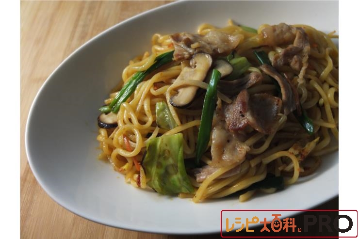 (1)にBとそばを加えて炒め、Cを加えて仕上げる。