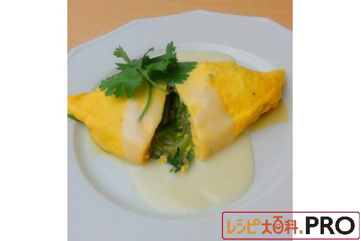 フライパンにバターを入れ、(1)の卵液の半量を一気に流し入れ、
