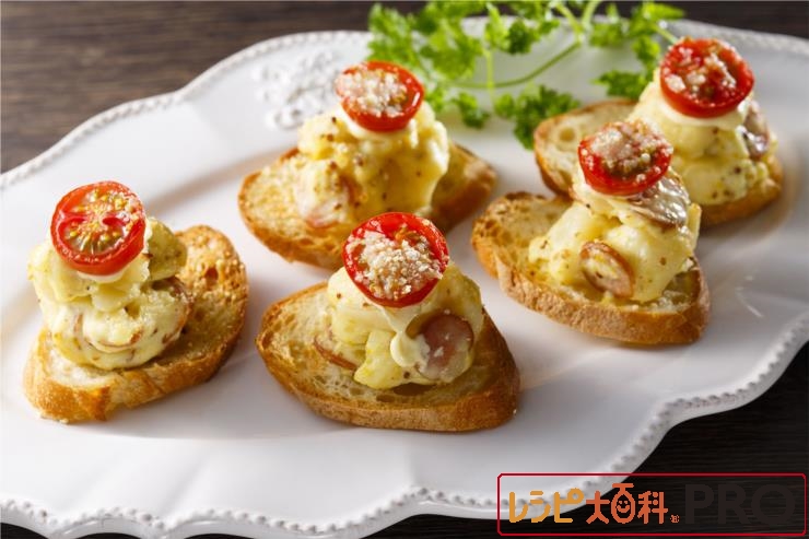 バゲットにポテトサラダを盛るだけ。お通しにもパーティメニューにもぴったりです。