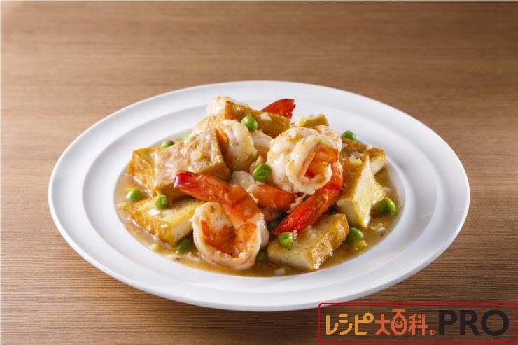 エビ、厚揚げ、グリンピース等をうま塩DRで炒めたさっぱり塩だれ炒め