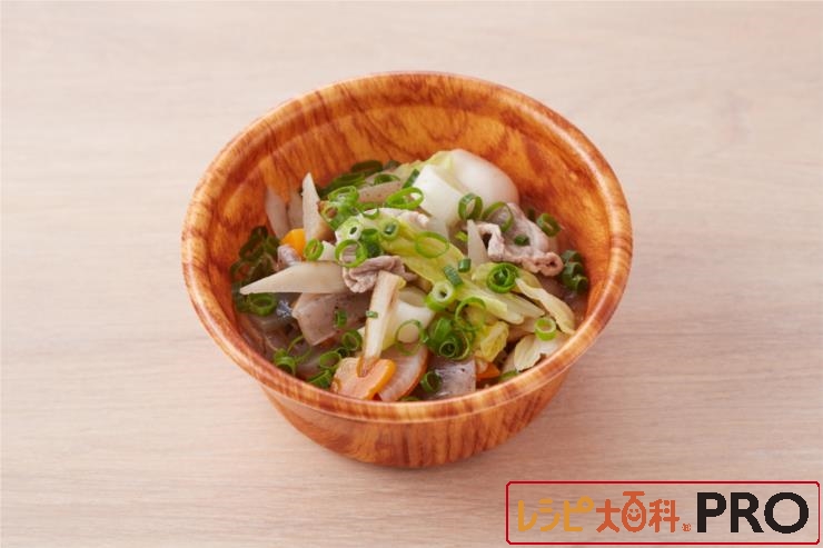 器にC30g、よく撹拌した(1)を210g、B43g、D53g、さといも2個(30g)を盛りつけ、小ねぎを散らす。