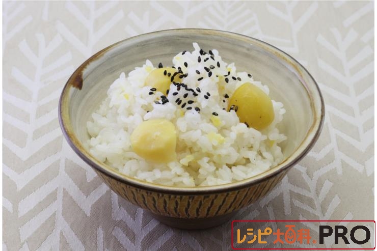炊飯釜に米を入れ、Aを入れて水加減し、栗をのせて炊く。