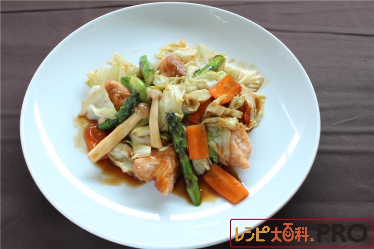 (1)のフライパンに残りのサラダ油を入れて熱し、Aを炒め、Bで調味する。