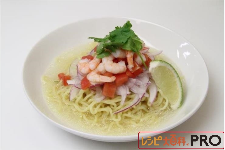 器に冷やしためんを盛り、(1)をかけ、Bを盛りつける。