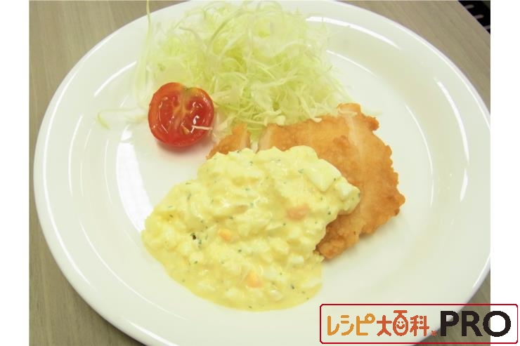 チキン南蛮はホテルパンに並べ、スチコン ホットエアーモード(150℃)で10分加熱調理し、お好みの大きさにカットする。