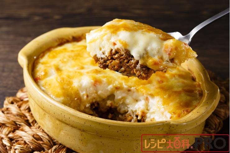 器に(1)をしっかりと敷き詰め、マッシュポテトを平らにならすように重ねてチーズをのせる。