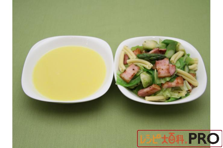 (3)のベーコンを炒めたフライパンに(1)を入れ、ひと煮立ちしたら(2)、B、塩少々(分量外)を加えて混ぜ合わせ、器に盛りつける。