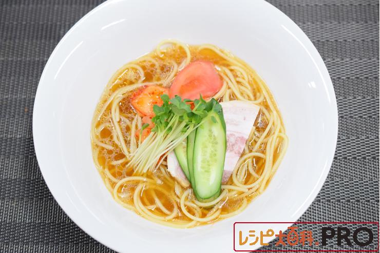 器に冷めんを盛り、Aをのせ、(1)をかけ、Bを盛りつける。