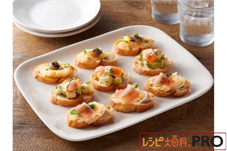 (1)に合わせたB、スモークサーモンをのせ、パセリを散らす。