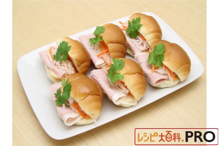 ロールパンに切り込みを入れて開き、ロースハムと大根・にんじんをはさみ、パクチーを飾り、盛りつける。