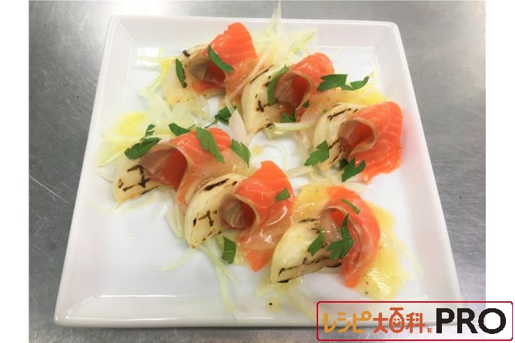 お皿に玉ねぎ、(1)、サーモンを盛りつけ、「ドレッシング地中海オリーブオイル&ハーブ」をかけ、イタリアンパセリを散らす。