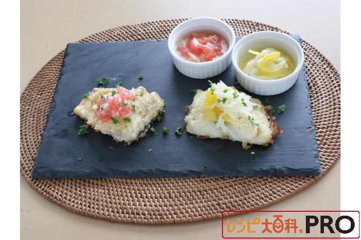 オーブンで焼くだけ、Wソースで楽しみます。ドレッシングを変えて味の変化も!