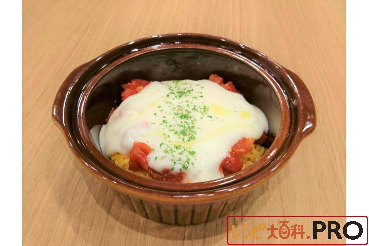器に(1)を盛り、スクランブルエッグをのせ、(2)をかける。