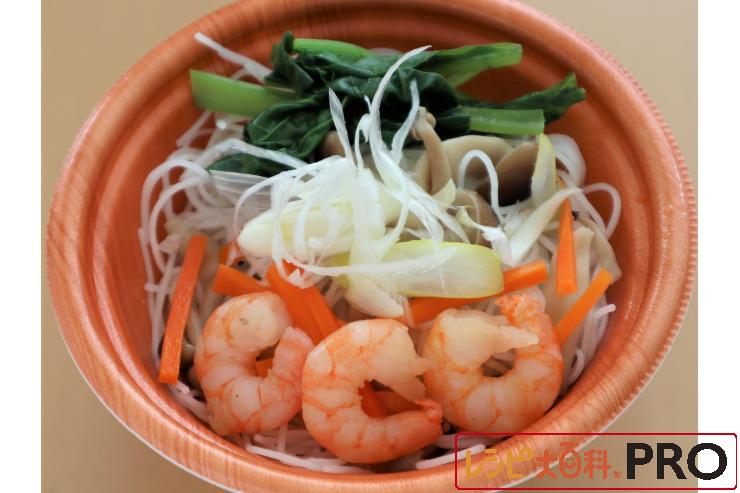 Aは熱湯で約1分下ゆでし、水きり後に冷却する。ビーフンは水戻し後、下ゆでする。