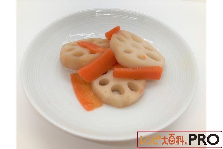 「味の素KKやわらかしっとり調理料(速効タイプ)」を使用することで、れんこんとにんじんの繊維がやわらかくなり、高齢者の方が食べやすく仕上がります。