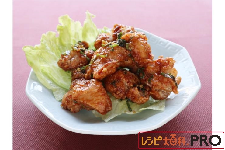 鶏もも肉に片栗粉をまぶし、180℃で3分30秒揚げる。