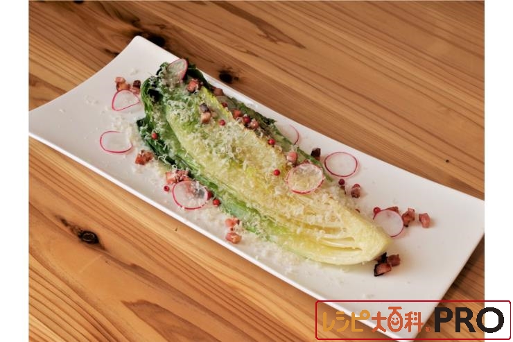 フライパンにオリーブオイルを入れて熱し、ロメインレタスを表面に焼き色をつけながら焼く。