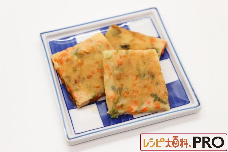 クッキングシートを敷いたホテルパンに(1)を薄く流して、スチコン コンビモード(180℃、湿度100%)で5~8分加熱し、カットして全面にウスターソースを塗る。