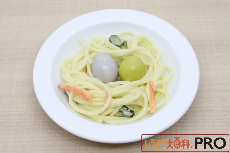 ホテルパンに冷凍スパゲッティを並べ、スチコン スチームモード(100℃)で約5分加熱し、オリーブオイルで和えておく。