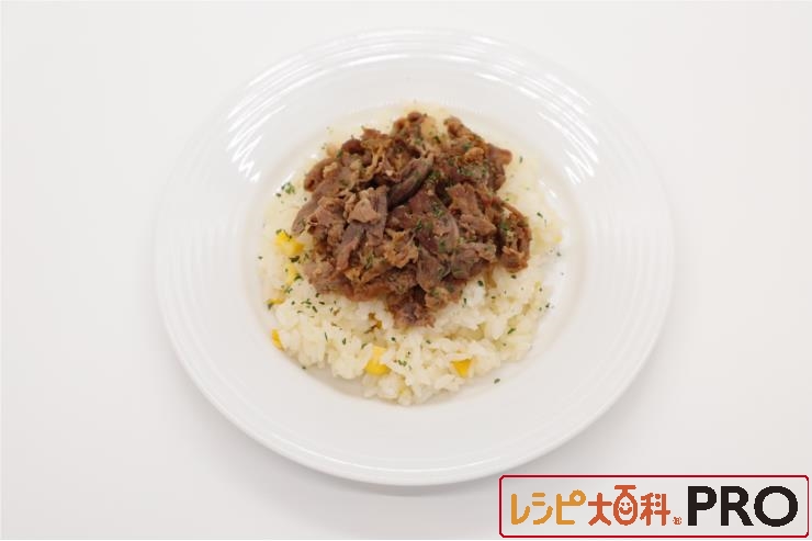 器に(2)のご飯を盛り、(1)の牛肉をのせ、ドライパセリをふる。