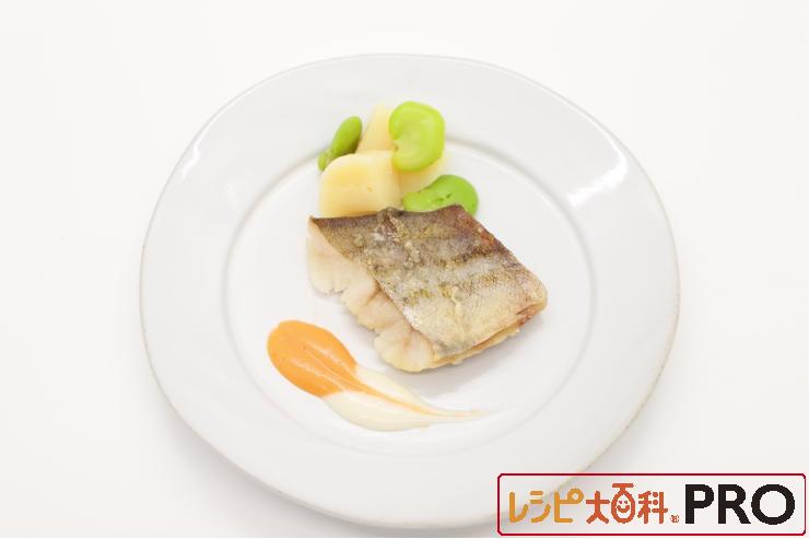 器の手前と中央に(3)の2色のソースをおき、中央のソースの上に(2)のたらを盛りつけ、(4)の野菜を添える。