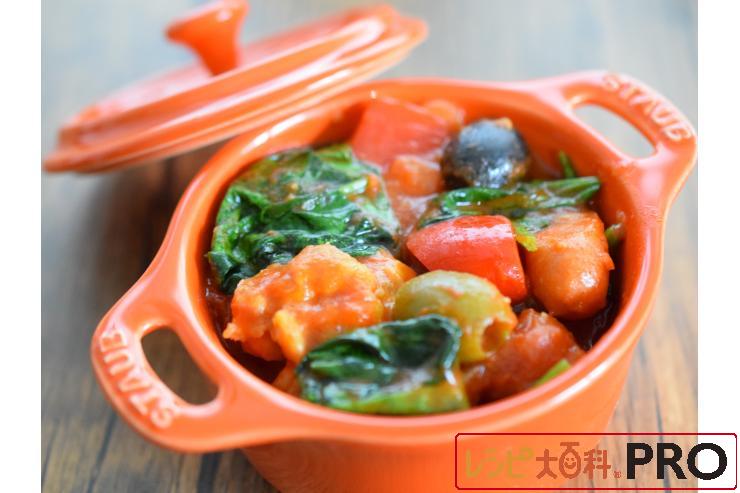 (2)にB、取り出した鶏肉、(1)のほうれん草を加えて煮る。