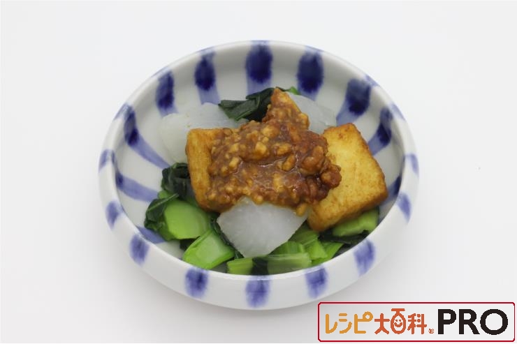 器に(1)のチンゲン菜を丸く囲うように盛り、中に(1)の大根、(2)の厚揚げをおき、(3)をかける。