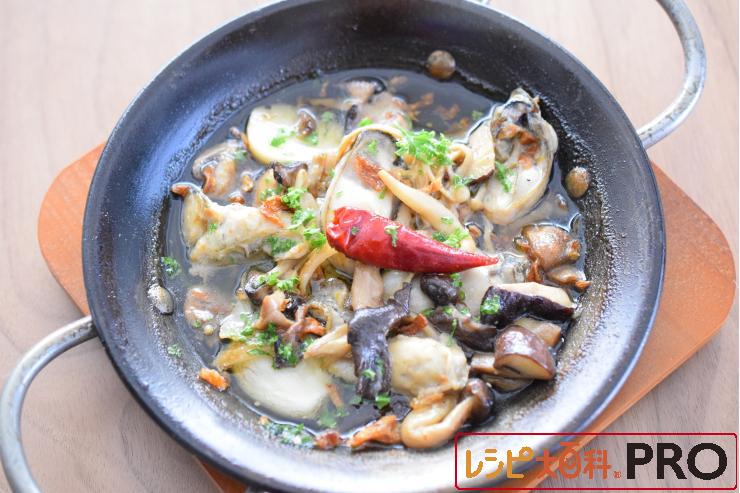 仕込みのきのこソテーに牡蠣を合わせたアヒージョ