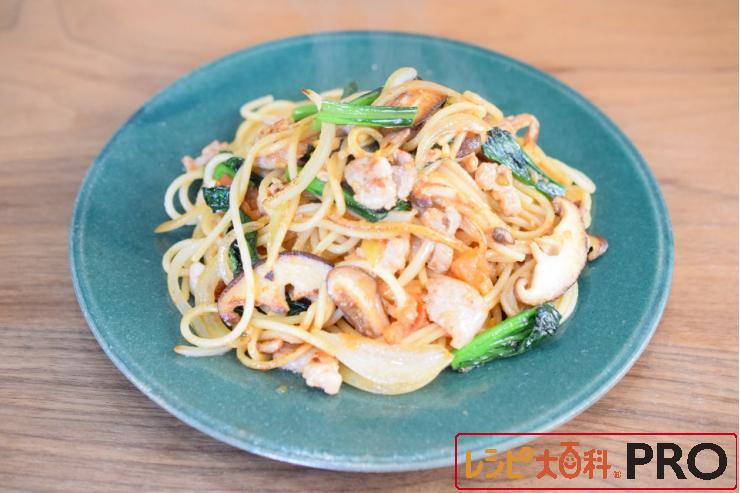 (1)にスパゲティーを加えて炒め、Cを加えてさらに炒め合わせる。