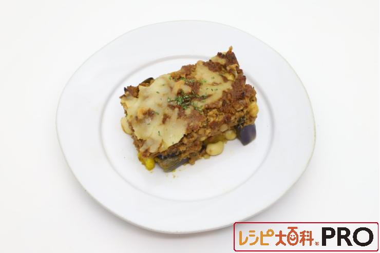 (1)、(2)を軽く合わせてクッキングシートを敷いたホテルパンに広げ、シュレッドチーズを散らし、スチコン コンビモード(200℃、湿度40%)で8~10分加熱し、ドライパセリをふる。