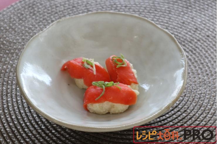 「十勝ポテトサラダ」きたあかり12gをひと口大に丸め、スモークサーモンをのせ、青ねぎを飾る。