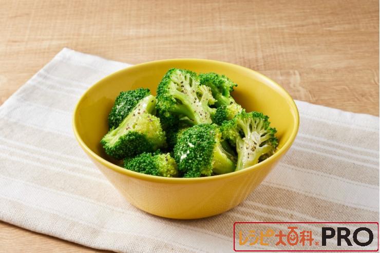 耐熱容器にブロッコリー、水を入れてふんわりラップをかけ、電子レンジ(600W)で3分ほど加熱する。途中で一度取り出し、全体を混ぜる。
