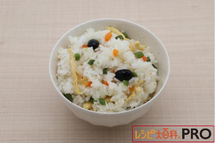 (1)にBを加え、器に盛りつけ、お好みでいり白ごまをふる。